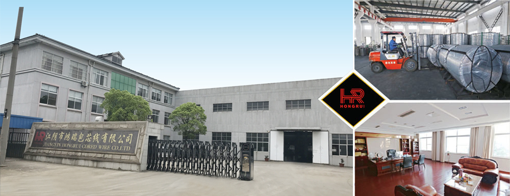 Established in 1995 , Jiangyin Hongrui Cored Wire Co , Ltd ( Previous Name Jiangyin Xinjugang Cored Wire Co , Ltd ) is located in the industrial park , Lingang street , Jiangyin City , Which is the largest and oldest cored wire factory in China , The company owns 12 lines , The annual output reaching 30,000 mt Cored wire, 8000 mt Calcium silicon ,5000mt Calcium metal,6000mt Carbon powder and 10000mt calcium Aluminate , The diameters of our cored wire measure 9mm ,10mm , 12mm , 13mm , 14mm , 15mm , 16mm , 21 mm respectively and our products include Casi cored wire , CaFe cored wire , Pure Ca cored wire ( include Ca Powder cored wire , Ca Rod cored wire , two-double Ca Rod cored wire C cored wire , S cored wire ,FEB cored wire , Simg cored wire , Al wire , Tife cored wire Fes cored wire , Femn cored wire , Pyritic cored wire , Fep cored wire , Alca cored wire . In addition , Some special products are available such as pure Mn cored wire CACN2 cored wire , pure Se cored wire , pure Te cored wire , pure Pb cored wire.Femo cored wire , Fev cored wire , Fenb cored wire , Lanthanon cored wire aluminum cored wire : Including oxygenated aluminum cored wire for steel-making with the diameter measuring 9 to 10mm and 12-13mm .